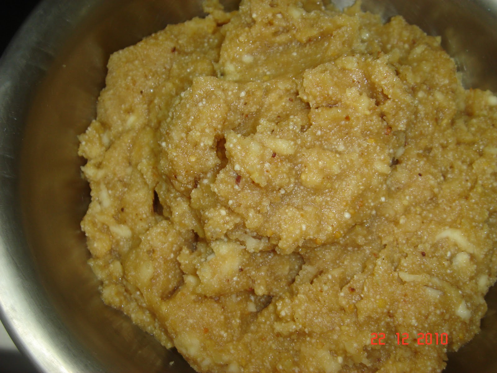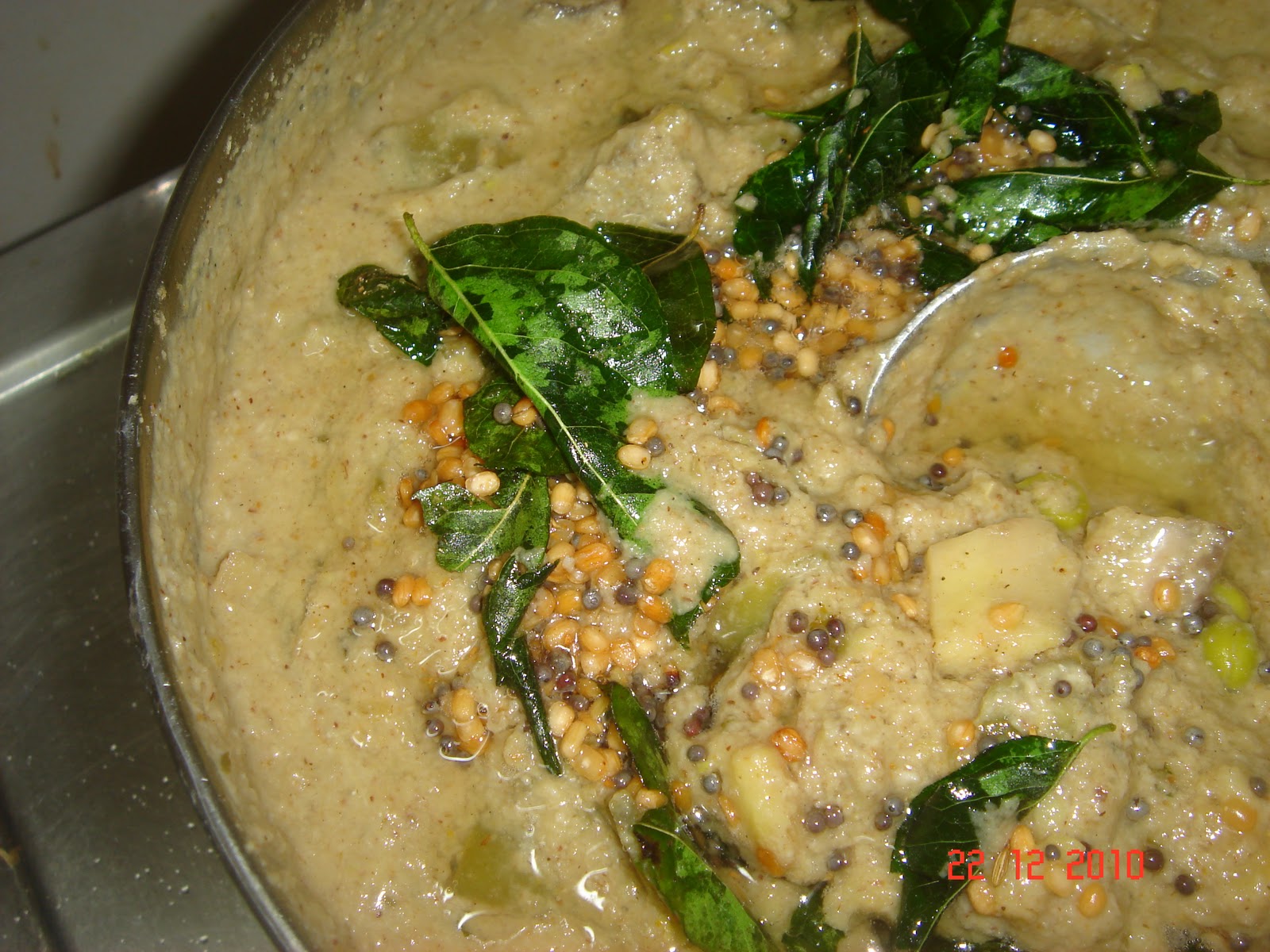 Add the tempering and mix well. Before taking it off flame add a spoon of the roasted rice-lentil flour used for kali. This adds a wonderful flavour to the side dish.