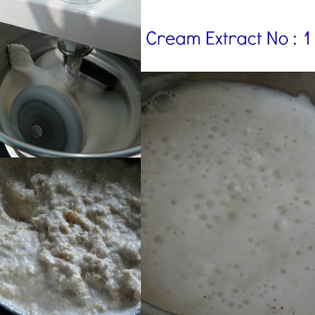 Cover the 3 bowls of milk extracts and let it remain undisturbed . After 2 to 3 hours, the thick milk would have settled in the bottom. Carefully scoop out all the water on the top of the three bowls and discard. Combine the thick milk in all the three bowls.