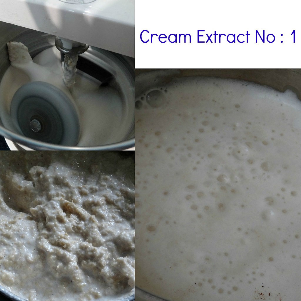 Cover the 3 bowls of milk extracts and let it remain undisturbed . After 2 to 3 hours, the thick milk would have settled in the bottom. Carefully scoop out all the water on the top of the three bowls and discard. Combine the thick milk in all the three bowls.