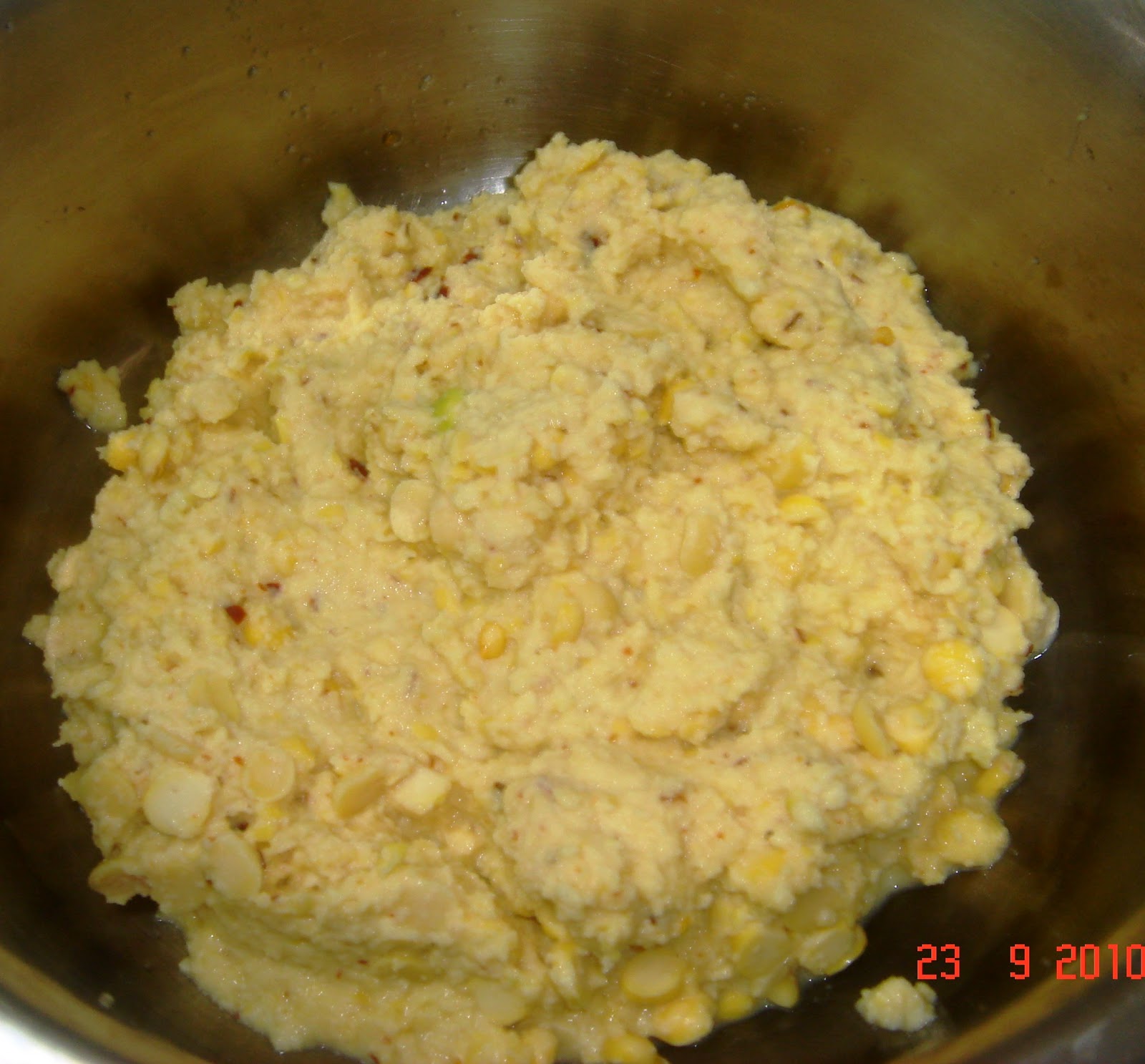 Now grind the lentils ( tuvar and bengal gram dal ), red chillis and salt coarsely.