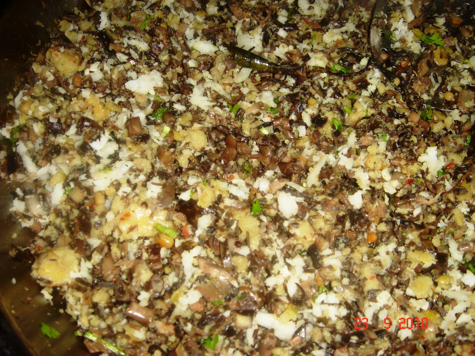 In a wok add some oil (preferably coconut) splutter mustard and urad dal. Add the curry leaves and the crumbled lentils and saute till golden brown. Now add the cooked vegetables and let it fry along with the lentils for some time.