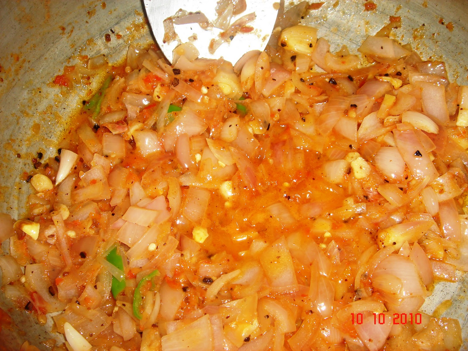 Now in a Pressure cooker add some butter and saute the roughly grounded whole spices.Add chopped garlic and slit green chillis and saute well. Now add the onions and stir fry till golden brown. Add chopped tomatoes  and saute.