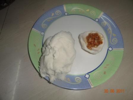 Assembling the modaks — Take a lemon sized ball and flatten with greased fingers and make a depression for placing the filling.Put a spoonful of the poornam/filling.