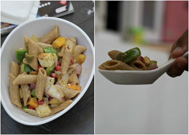 Coming to the salad, the star of the dish is definitely the wheat penne supported by the fruits in it – the luscious mangoes, the crisp apples and the red pearly pomegranates add to the zing. Besides, the slightly pungent taste of the onions and the succulent cottage cheese cubes ups the ante!