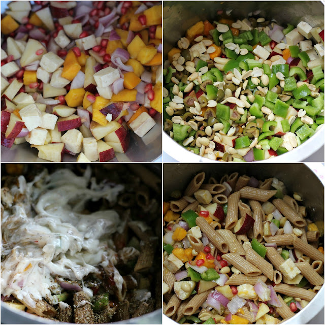 In a big bowl add the cubed mangoes, apples, red pearls, cottage cheese, peanuts, olives, green pepper and the onion. Mix it and refrigerate for 2-3 hours. In the meanwhile, cook the pasta as per the instructions of the packet. The penne should not be overtly mushy, neither should it be al dente but just perfectly cooked.  Bring the nutty mix from the fridge and add the cooked pasta, black pepper powder, Italian seasoning and salt and mix well.